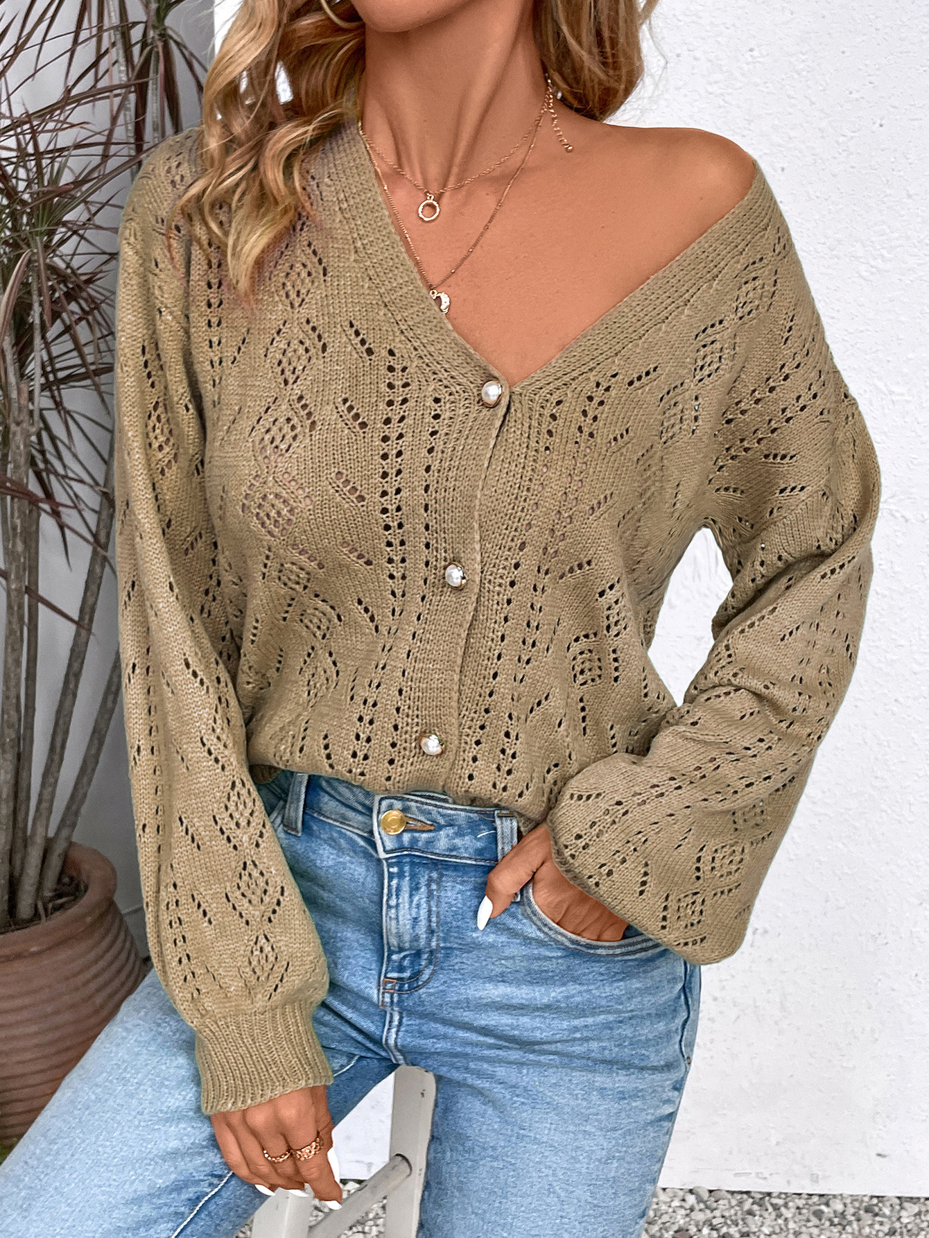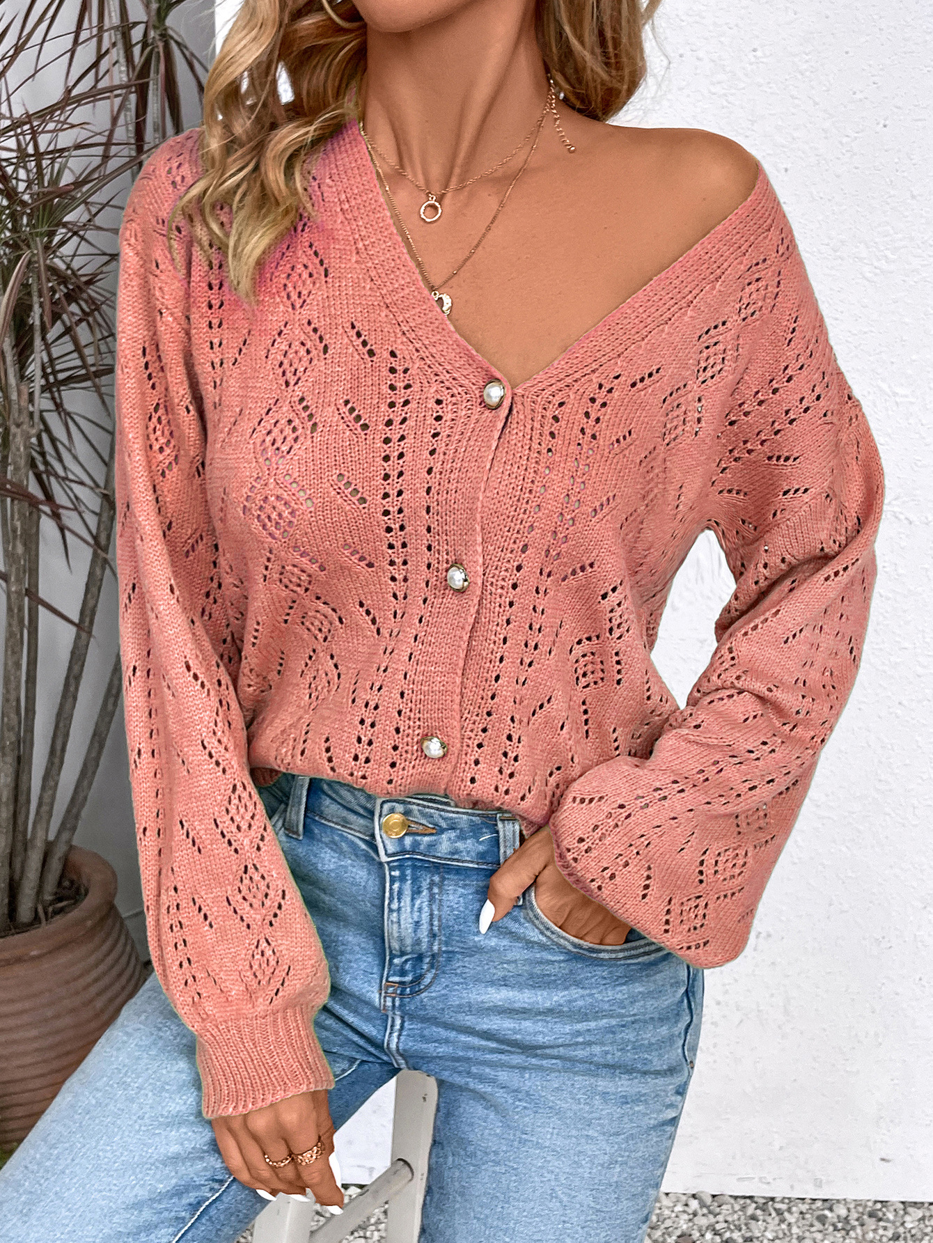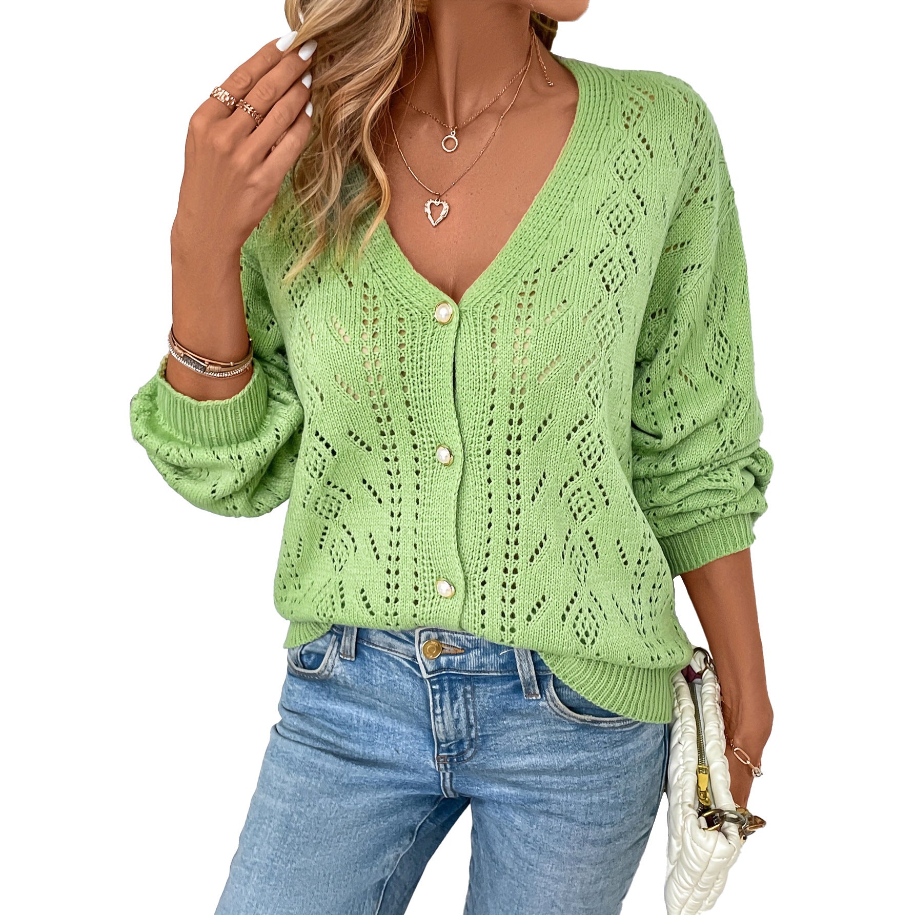 V-neck Hollow-out Single-breasted Long-sleeve Knit Cardigan
