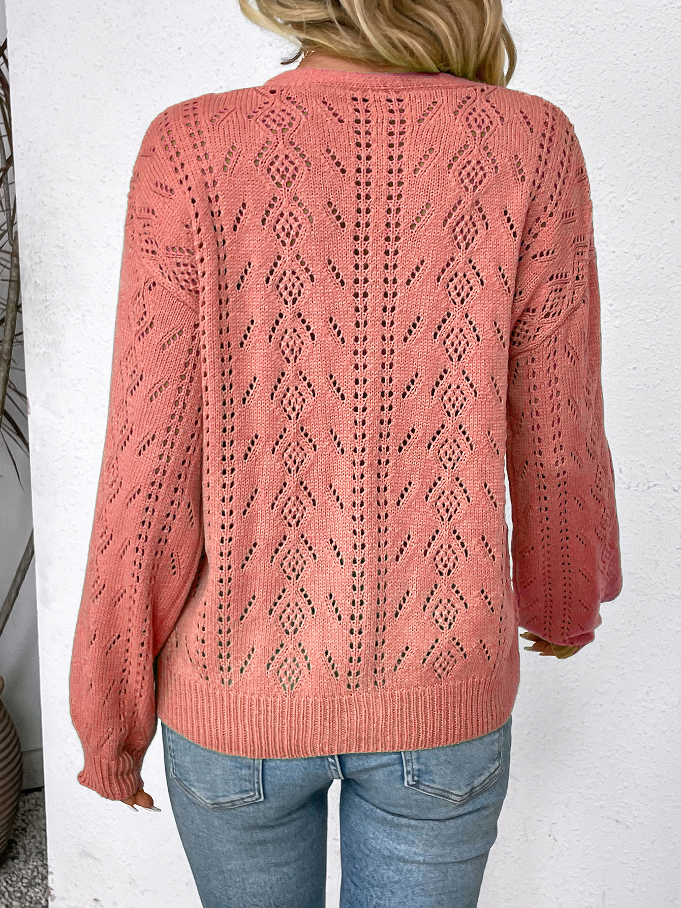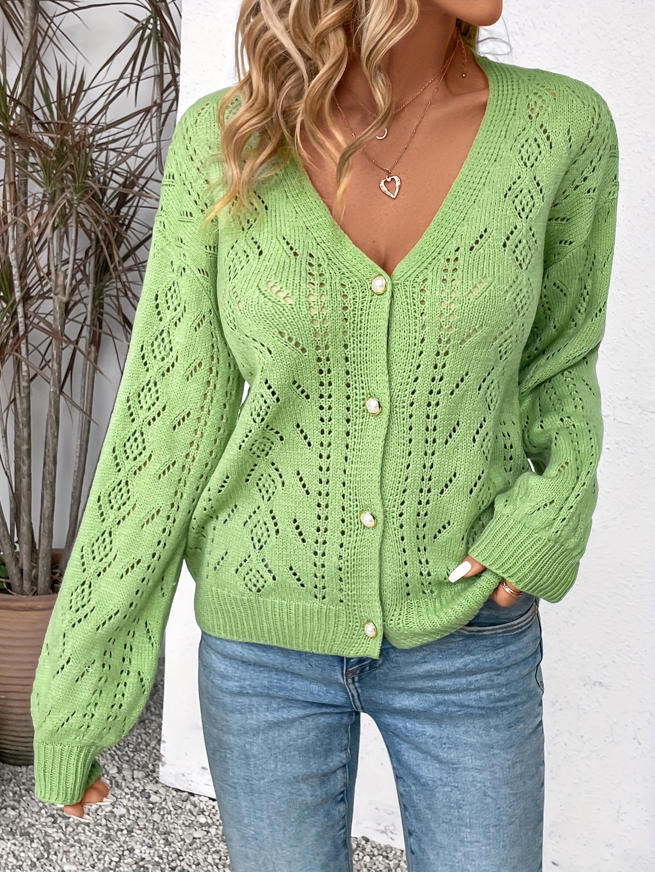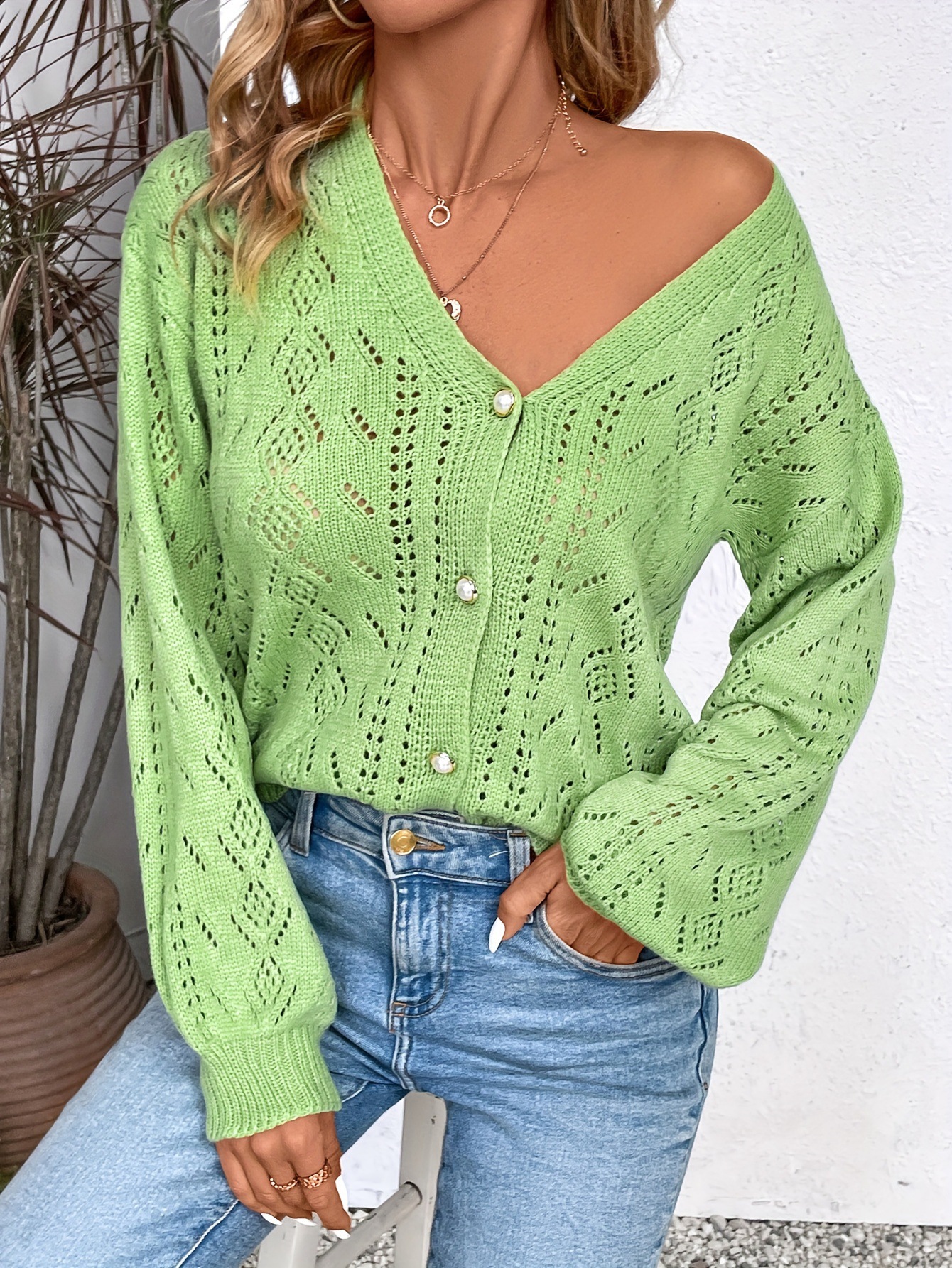 V-neck Hollow-out Single-breasted Long-sleeve Knit Cardigan