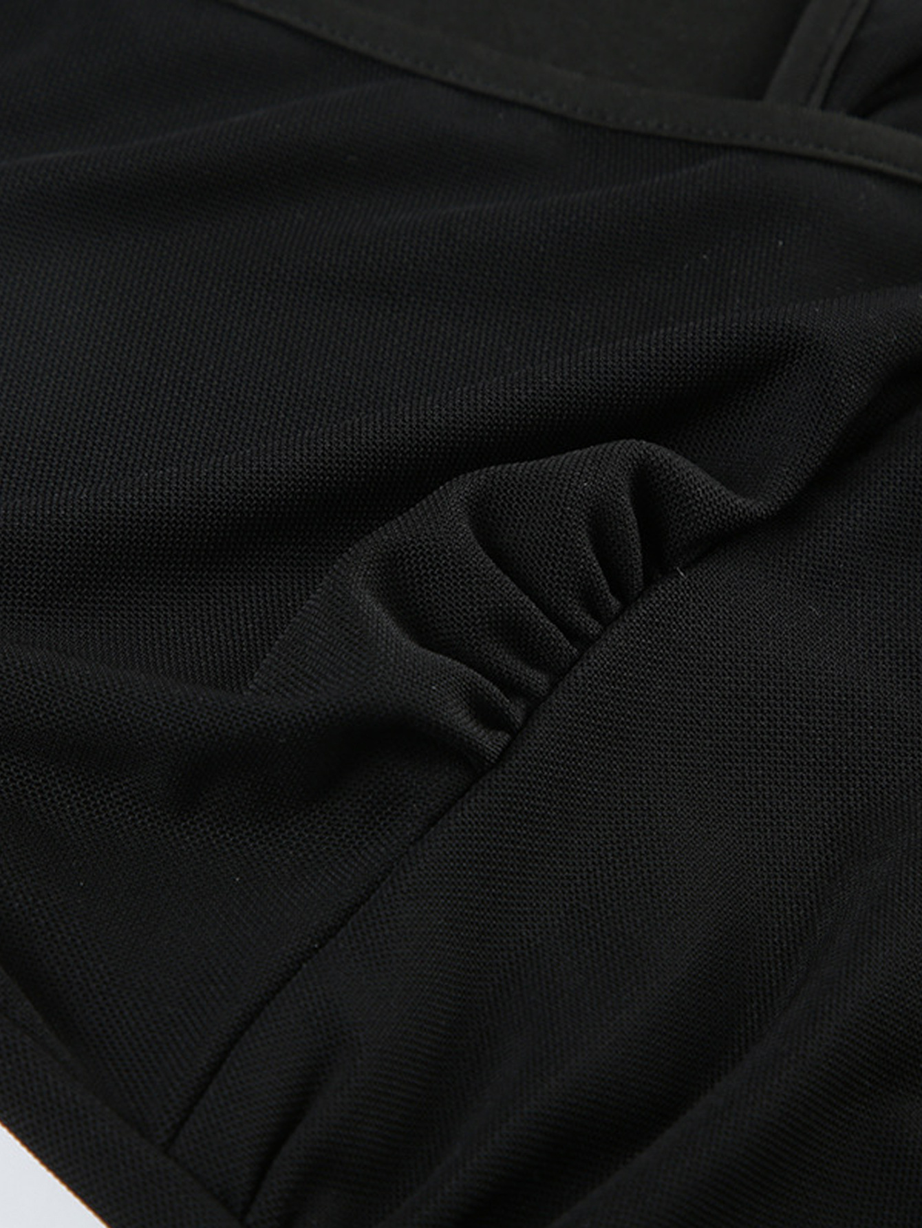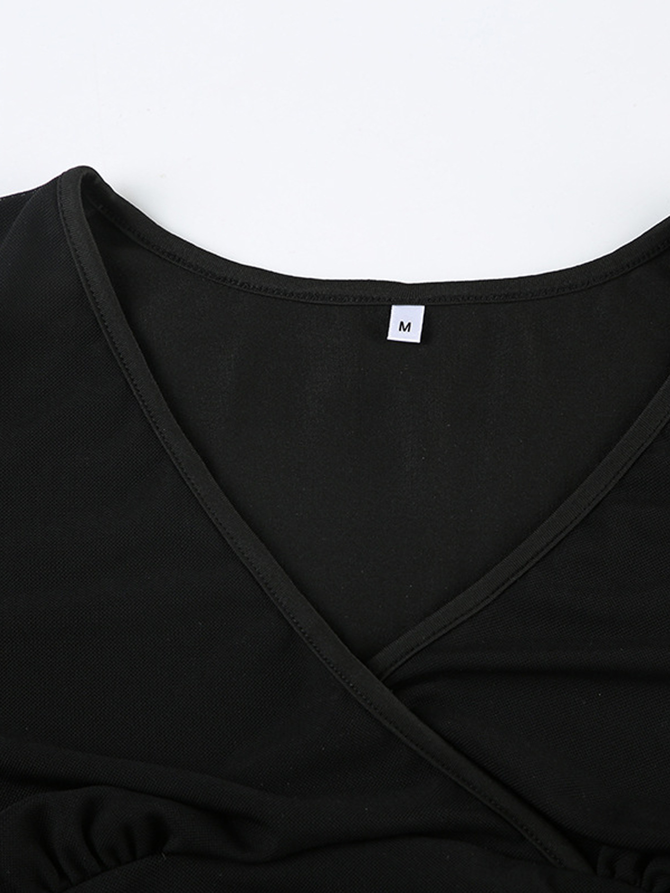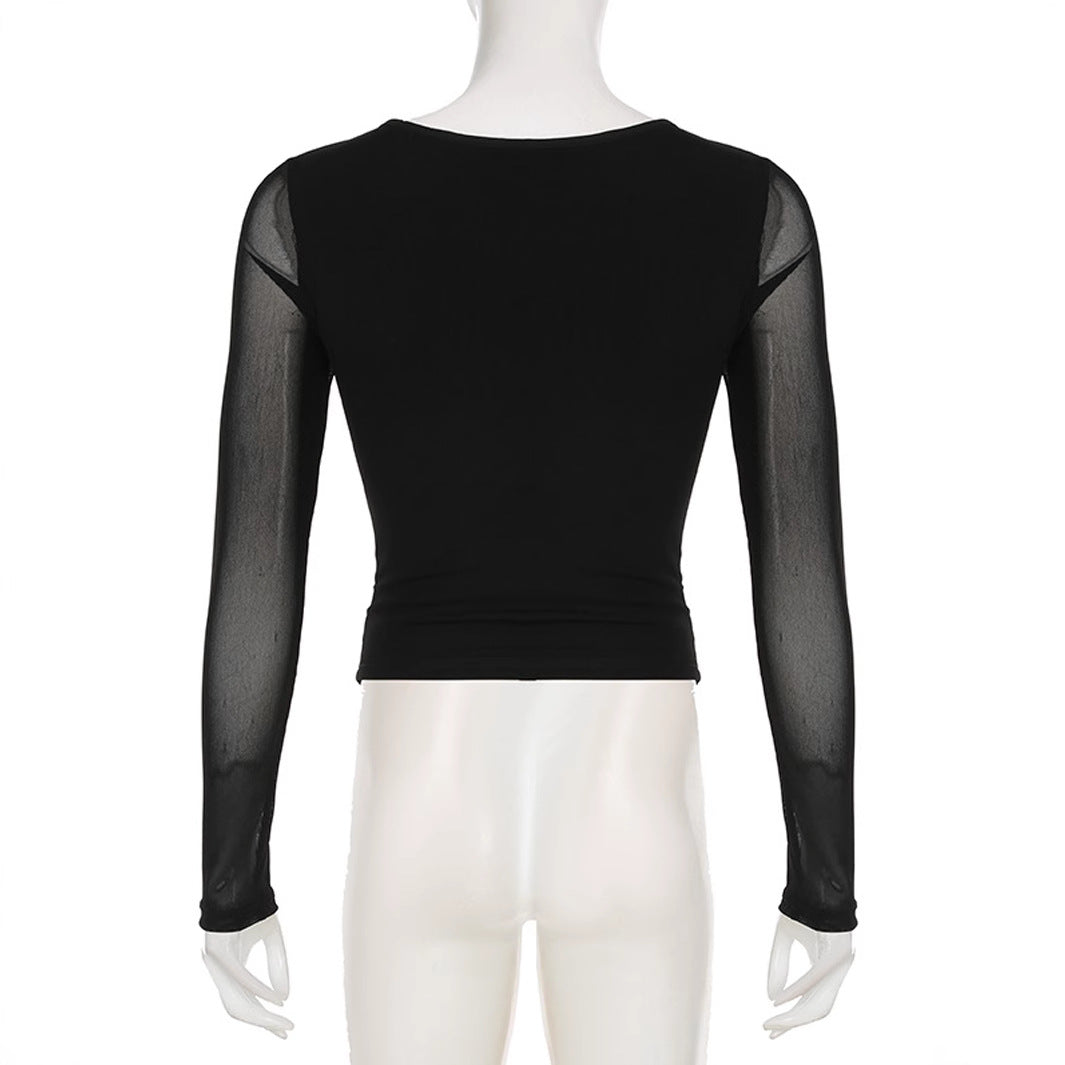 V-neck Solid-Color Mesh-Patchwork Pleated Slim-Fit T-Shirt