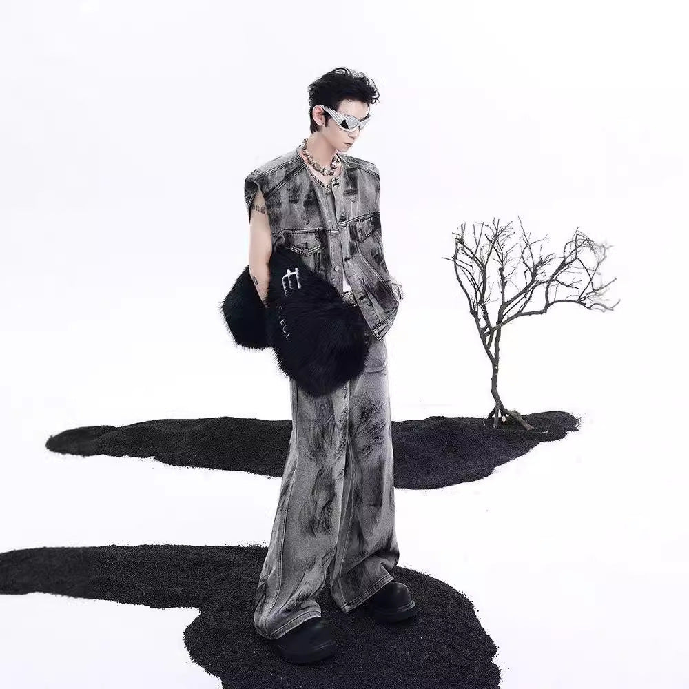 American Street Graffiti Padded Shoulder Sleeveless Denim Coat