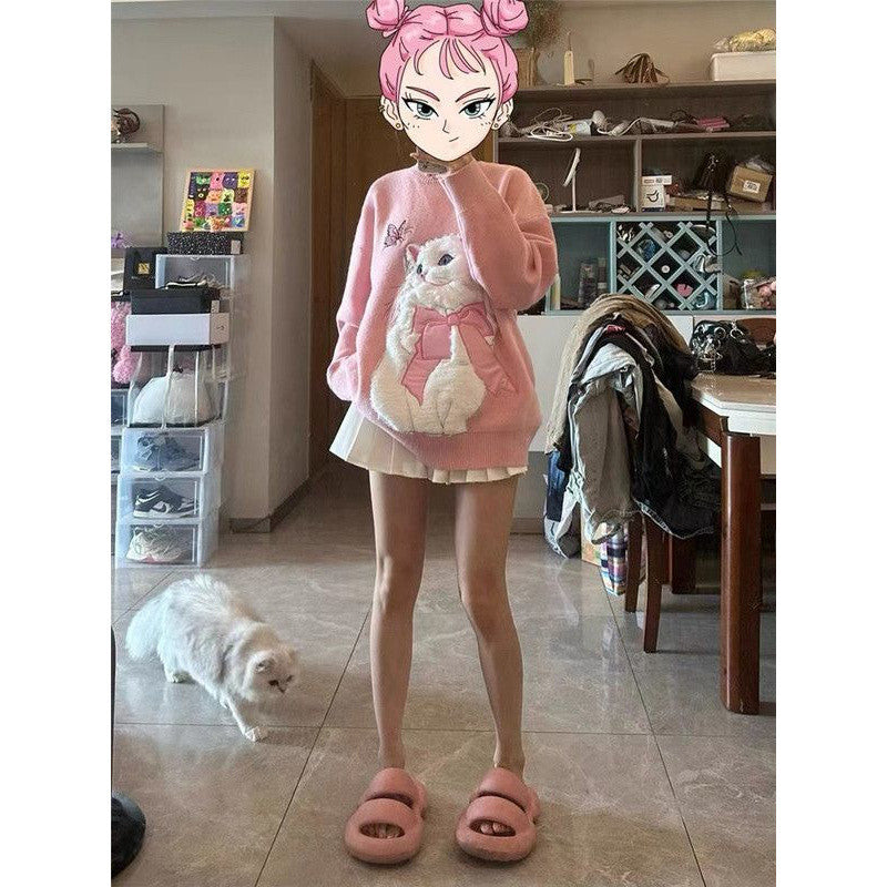 Autumn And Winter Thickening Sweater Dopamine Wear Salt Cute Flocking Cat Design Sweet Girl Style