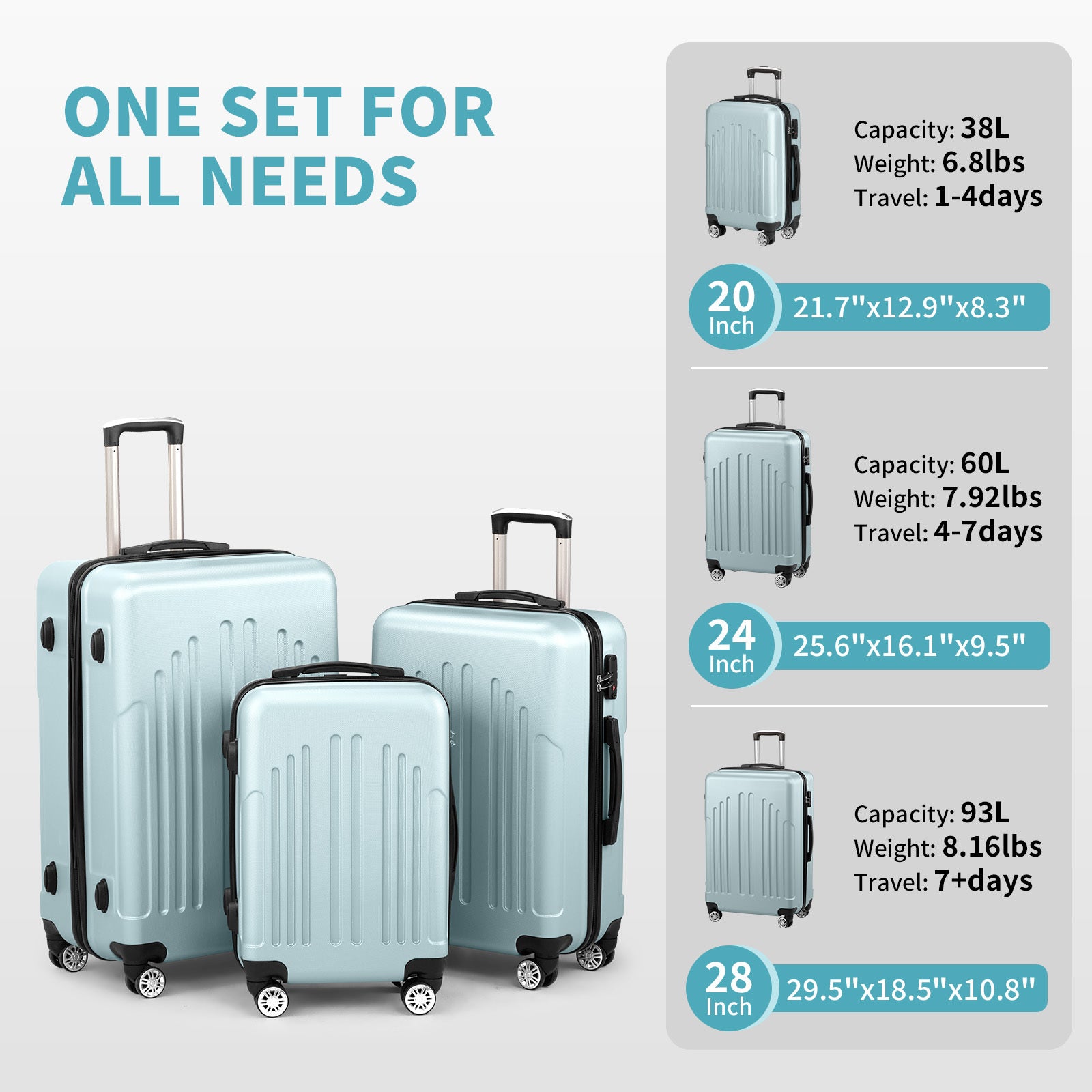 The 3-piece luggage set is made of high-quality ABS+PC material, which is durable, wear-resistant and waterproof. It comes in three sizes: 20 inches, 24 inches and 28 inches, meeting the needs of various travel scenarios.
